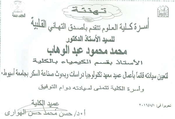 تهنئة من أسرة كلية العلوم للسيد الأستاذ الدكتور / محمد محمود عبد الوهاب 2 أغسطس 2016 تهنئة من أسرة كلية العلوم للسيد الأستاذ الدكتور / محمد محمود عبد الوهاب