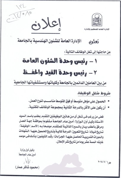 تعلن الإداره العامه للشئون الهندسيه بالجامعه عن حاجتها لوظائف 22 مايو 2014 تعلن الإداره العامه للشئون الهندسيه بالجامعه عن حاجتها لوظائف
