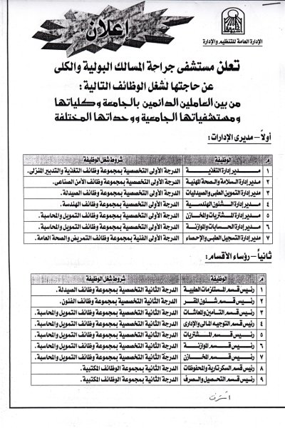 تعلن مستشفى جراحة المسالك البوليه والكلى عن حاجاتها لشغل وظائف 22 نوفمبر 2014 تعلن مستشفى جراحة المسالك البوليه والكلى عن حاجاتها لشغل وظائف