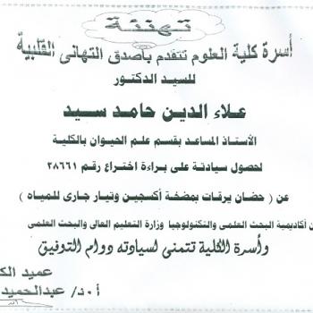 Congratulation to Dr. Alaa El-Din Hamid Sayed