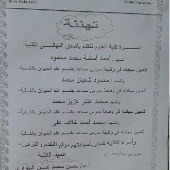 أسرة قسم علم الحيوان بالكلية يتقدم بأصدق التهاني القلبية