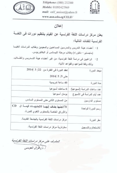 دورات في اللغة الفرنسية 8 مارس 2014 يعلن مركز دراسات اللغة الفرنسية عن القيام بتنظيم دورات فى اللغة الفرنسية للراغبين في دراسة اللغة الفرنسيةمن أعضاء هيئة التدريس ومعاونيهم وغيرهم والطلاب