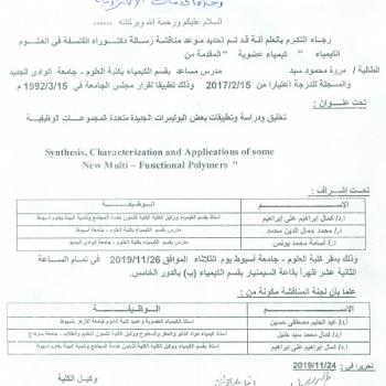 مناقشة رسالة الدكتوراه المقدمة من / مروة محمود سيد - قسم الكيمياء