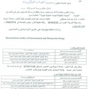 مناقشة رسالة الماجستير المقدمة من /عزة سيد تمام مصطفي - قسم الكيمياء