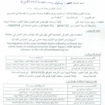 تحديد موعد مناقشة رسالة الدكتوراه المقدمة من / زينب حمزة أحمد - قسم علم الحيوان