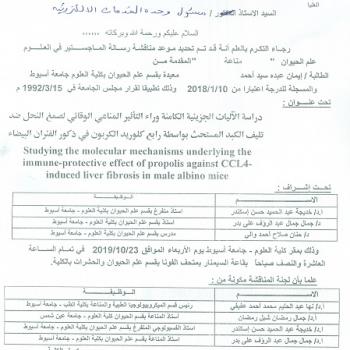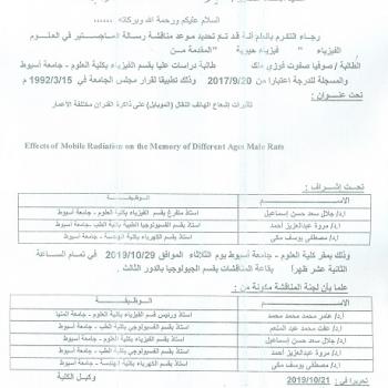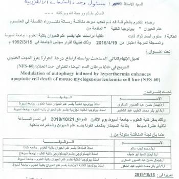 تحديد موعد مناقشة رسالة الماجستير المقدمة من الطالبة / ايمان عبده سيد - قسم علم الحيوان
