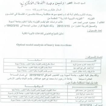 تحديد موعد مناقشة رسالة الدكتوراه المقدمة من الطالب / محمود عيسى احمد - قسم الفيزياء