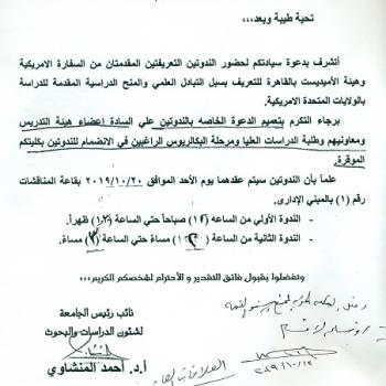 اليوم انعقاد الندوات التعريفية المقدمة من السفارة الامريكية وهيئة الاميديست للتعريف بسبل التبادل العلمي والمنح الدراسية