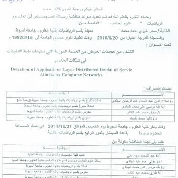 تحديد موعد مناقشة رسالة الماجستير المقدمة من الطالبة / سحر خيري احمد - قسم الرياضيات