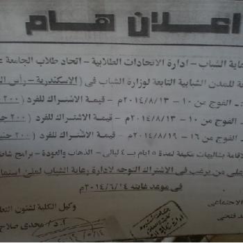 أخر موعد لتسجيل الأسماء في الأفواج الثلاثة يوم 2014/6/14 م بإدارة رعاية الشباب بالكلية