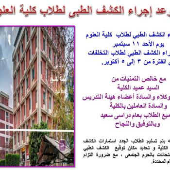 موعد الكشف الطبى للطلاب الجدد بكلية العلوم