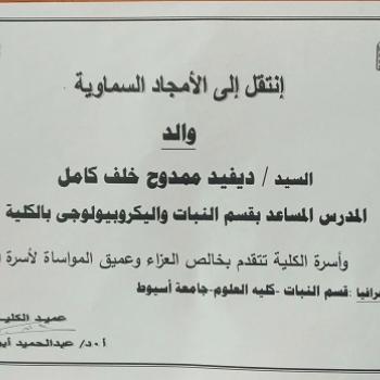 ينعي الاستاذ الدكتور عبد الحميد ابو سحلي عميد كليه العلوم واسره كليه العلوم جميعا بمزيد من الحزن والأسى الاستاذ الدكتور محمد عبد العزيز استاذ الكيمياء الفيزيائيه بكلية العلوم بقنا .
