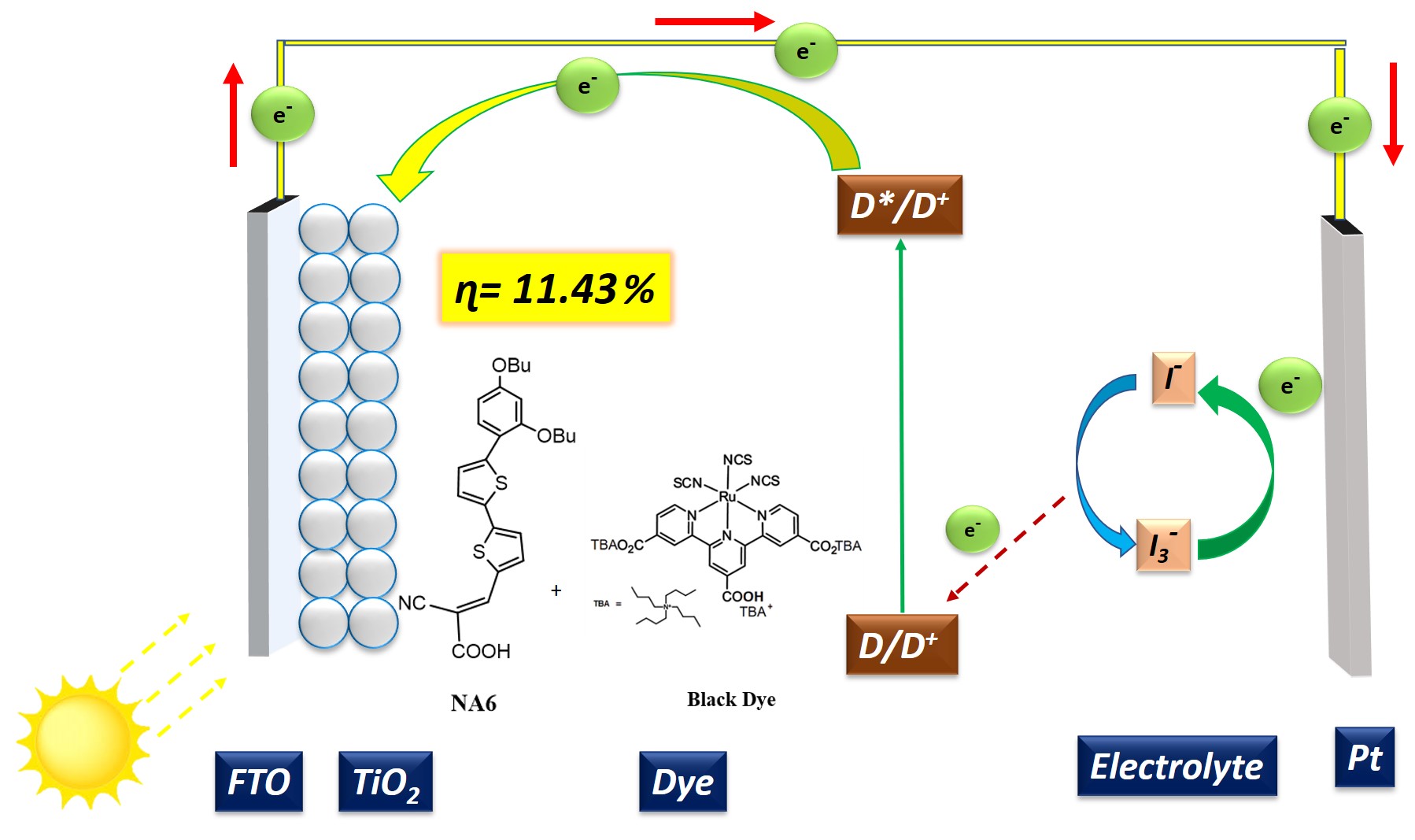A series of efficient donor-π-acceptor tiny organic dyes NA1, NA6, and NA7 were developed as co-sensitizers to improve the photovoltaic performance of the black dye-based dye-sensitized solar cells (DSCs). Dye aggregation on the TiO2 surface was reduced, and improved sensitizer coverage was achieved through the introduction of a long alkoxy group in the donor part, the tuning of the anchoring parts, and the π-spacer of the co-sensitizer NA6. The spectral photoresponse was thereby dramatically improved across the spectrum from the ultraviolet to the visible range, and the recombination process was suppressed for the (black dye+NA6) co-sensitized cell compared with a single black dye. The co-sensitized black dye+NA6-based DSCs show a considerable increase in Voc (open-circuit voltage), Jsc (short-circuit current density), and FF (fill factor) to 721 mV, 21.64 mAcm−2 and 0.733, respectively. A higher efficiency of 11.43% was, consequently, achieved for the (black dye+NA6) co-sensitized cell compared to 10.56% for the DSCs based on a single black dye.