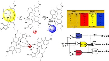 A multi-channel rhodamine-pyrazole-based chemosensor (RhPzNH2) was prepared by a simple synthetic method. The photophysical characteristics of the compound were determined in various organic solvents. The new probe responded discriminately to acidic and basic pHs; in acidic media (pH < 3) it produced a yellow emission centered at 555 nm, while in basic media (pH > 10) its emission was blue with a maximum at 460 nm. Moreover, the new RhPzNH2 sensor responded significantly to Cu2+ by increasing the absorbance at 530 nm (limit of detection (LOD) 7×10−8 M). The stoichiometric ratio of Cu2+ ions and the probe in the complex formed was found to be 1:2, respectively. Possible structural arrangements of the ligand molecule and Cu2+ in the complex were studied by DFT computations and the most likely structural organization was proposed. Furthermore, the responses of the [(RhPzNH2)2-Cu]2+ complex were significant towards Ba2+ and CN. The substitution of Cu2+ in the complex decreased remarkably the absorbance at 530 nm by 72 %. On the other hand, CN increased both the absorbance at 530 nm and the fluorescence emission at 550 nm by sharing it in the coordination within the complex increased solubility of the complex, and blocked the energy transfer from the compound to Cu2+. Moreover, the RhPzNH2 mimicked three different INHIBIT logic gates that can be integrated to work as a molecular digital comparator.