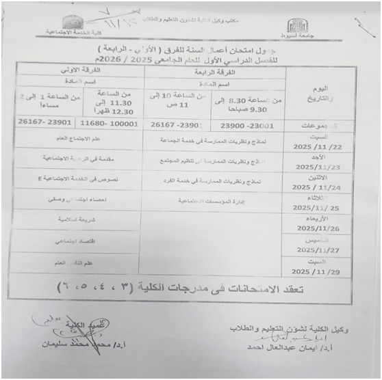تُعلن كلية الخدمة الاجتماعية – جامعة أسيوط عن جدول أعمال السنة لطلاب الفرقة الأولى والرابعة، وسوف تعقد الامتحانات بمدرجات الكلية(٣، ٤، ٥، ٦)