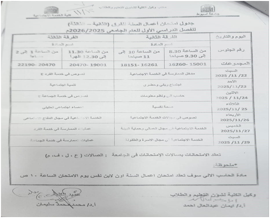 تُعلن كلية الخدمة الاجتماعية – جامعة أسيوط عن جدول أعمال السنة الدراسية لطلاب الفرقة الثانية والثالثة، وسوف تعقد الامتحانات بصالاات الامتحانات فى الجامعة( ع، ل، ف، م)