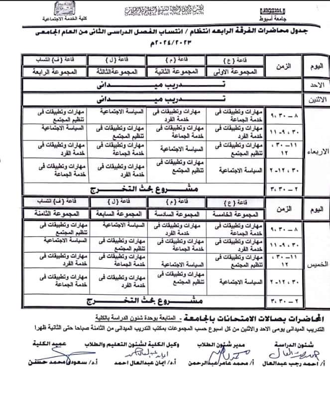 الجدول الدراسى للفصل الدراسى الثانى للفرقة الرابعة انتظام - انتساب للعام الجامعى 2023/2024 11 فبراير 2024