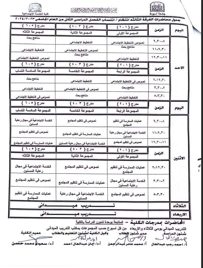 الجدول الدراسى للفصل الدراسى الثانى للفرقة الثالثة انتظام - انتساب للعام الجامعى 2023/2024 11 فبراير 2024
