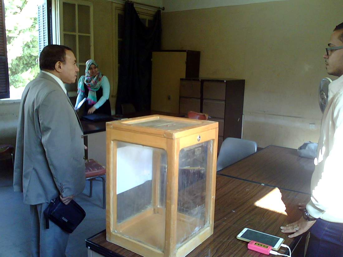 و قام السيد الاستاذ الدكتور / احمد محمد حسن البريرى عميد الكلية بتفقد سير العملية الانتخابيه والتأكيد على إشتراك اثنين من الطلاب كمراقبين لسير العملية الانتخابية بكل فرقة دراسية. كما قام بالمرور على اللجان كلا من السيد الاستاذ الدكتور / شريف سنوسى عبد اللطيف وكيل الكلية لشئون التعليم والطلاب و السيد الاستاذ الدكتور/ حمدى احمد سيد ابومساعد وكيل الكلية لشئون تنمية البيئة وخدمة المجتمع للاطمئنان على سير العمليه الانتخابيه .