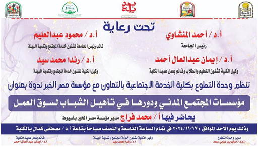 تنظم وحدة التطوع بكلية الخدمة الأجتماعية بالتعاون مع مؤسسة مصر الخير ندوة بعنوان: «المجتمع المدني ودوره التطوعي في تأهيل الشباب لسوق العمل» وذلك يوم الأحد الموافق 17/11/2024 في تمام الساعة "التاسعة والنصف صباحاً" بقاعة الدكتور مصطفي كمال بالكلية.