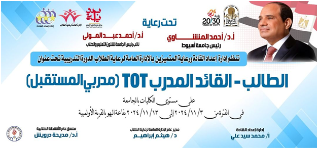 دعوة لمشاركة الطلاب والطالبات في الدورة التدربية تحت عنوان الطالب _القائد المدرب ToT(مدربي المستقبل ) 6 نوفمبر 2024 إدارة إعداد القادة بالإدارة العامة لرعاية الطلاب دعوة لمشاركة الطلاب والطالبات في الدورة التدربية تحت عنوان الطالب _القائد المدرب ToT(مدربي المستقبل )