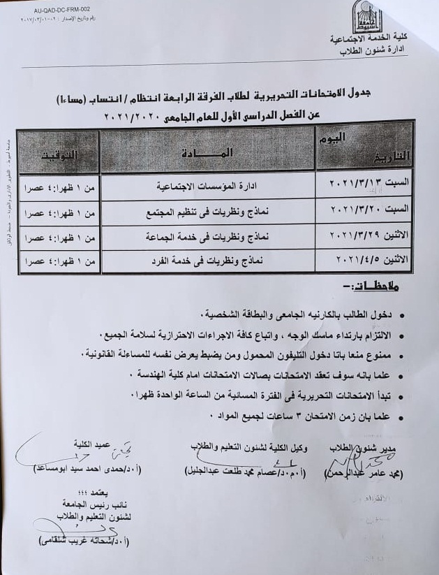 جدول الامتحانات التحريرية لطلاب الفرقة الرابعة انتظام/ انتساب عن الفصل الدراسى الأول للعام الجامعى 2020/2021