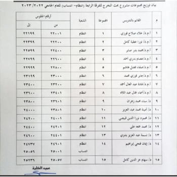 بيان توزيع مجموعات مشروع بحث التخرج للفرقة الرابعه (انتظام/انتساب) للعام الجامعى 2022/2023