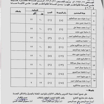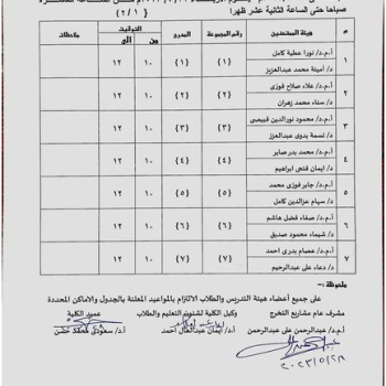 جدول امنحانات مشروع بحثى التخرج الفرقة الرابعة (انتظام/انتساب) يوم الخميس 22/6/2023