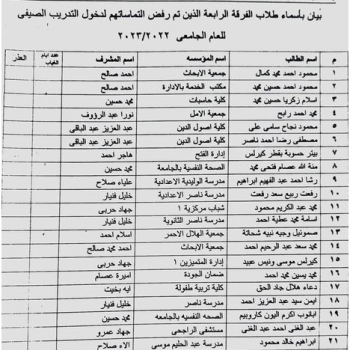 بيان بأسماء طلاب الفرقة الرابعة الذين تم رفض التماساتهم لدخول التدريب الصيفى للعام الجامعى 2022/2023