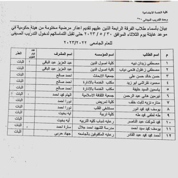 بيان باسماء طلاب الفرقة الثالثة الذين تم رفض التماساتهم ويعتبروا راسبون فى التدريب الميدانى للعام الجامعى 2022/2023
