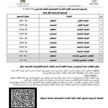 الرسوم الدراسية لكلية الخدمة الاجتماعية للعام الدراسى 2024/2025