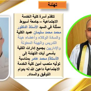 تتقدم كلية الخدمة الاجتماعية بأجمل التهانى للسيد الفاضل الأستاذ/ محمد عامر عبدالرحمن
