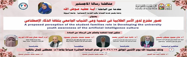 في إطار حرص كلية الخدمة الاجتماعية – جامعة أسيوط على دعم البحث العلمي ومواكبة التحولات الرقمية الحديثة، تُعقد مناقشة رسالة الماجستير المقدمة من الباحثة: