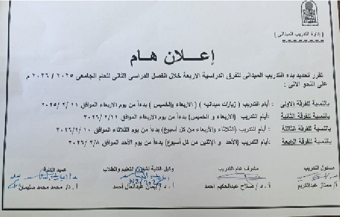 📢 في إطار تنظيم التدريب الميداني خلال الفصل الدراسي الثاني للعام الجامعى ٢٠٢٥ / ٢٠٢٦م، تعلن كلية الخدمة الاجتماعية عن مواعيد بدء التدريب الميداني لكل فرقة دراسية على النحو التالي: