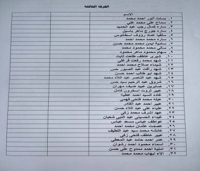 تُهيب إدارة الكلية بالسادة طلاب الفرقة الثالثة، الواردة أسماؤهم بالكشوف المرفقة، سرعة التوجه إلى إدارة رعاية الشباب، وذلك للأهمية القصوى.