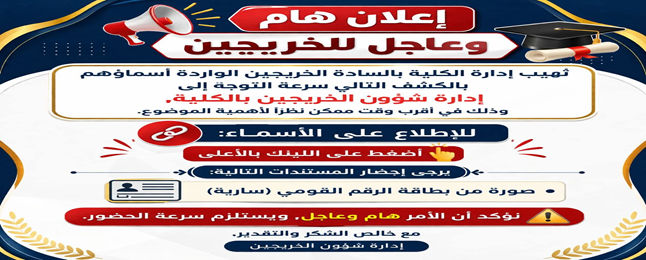 تدعو إدارة الكلية السادة الخريجين الواردة أسماؤهم بالكشف التالي سرعة التوجه إلى إدارة شؤون الخريجين بالكلية، وذلك في أقرب وقت ممكن نظرًا لأهمية الموضوع.