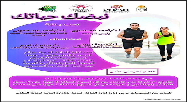 تعلن إدارة اللياقة البدنية بالإدارة العامة لرعاية الطلاب عن تنفيذ فعاليات مراكز التدريب الرياضية تحت شعار "نبضك حياتك"، وذلك في إطار الاهتمام بنشر ثقافة ممارسة الرياضة والحفاظ على الصحة العامة، إلى جانب التوعية بمخاطر الإدمان والمخدرات.