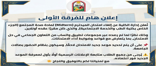 اعلان هام للفرقة الاولى 2 أبريل 2026 الغاء امتحان مادة صحة المجتمع الاون لاين ..وباقي الامتحانات بجدول الميدتيرم في موعدها غدا بصالات الجامعة حضوريا