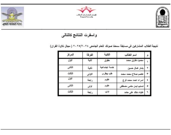 وتعلن إدارة النشاط الثقافى نتيجة مسابقة سمعنا صوتك "تلاوة القرآن الكريم - التقديم الإعلامى - والالقاء "