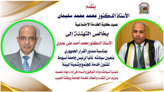 وفي هذا السياق يتقدّم معالي الأستاذ الدكتور محمد محمد سليمان، عميد كلية الخدمة الاجتماعية، والسادة الوكلاء وأعضاء هيئة التدريس والهيئة المعاونة والاداريون بالكلية بخالص التهنئة والتبريكات إلى الأستاذ الدكتور محمد أحمد علي عدوي، بمناسبة صدور القرار الجمهوري بتعيين سيادته نائبًا لرئيس جامعة أسيوط لشئون خدمة المجتمع وتنمية البيئة.