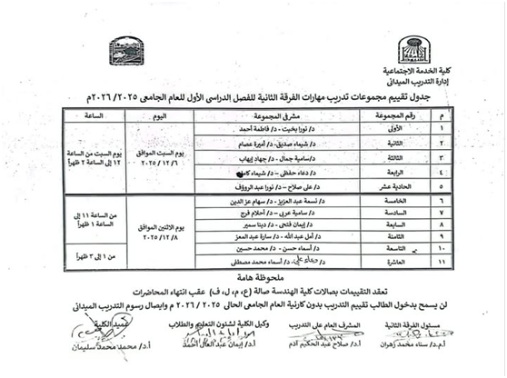 سوف يتم عقد تقييم مجموعات تدريب مهارات الفرقة الثانية للفصل الدراسي الأول للعام الجامعى ٢٠٢٦/٢٠٢٥ ، كلاً وفقاً رقم مجموعته المرفق بالجدول علي يومين