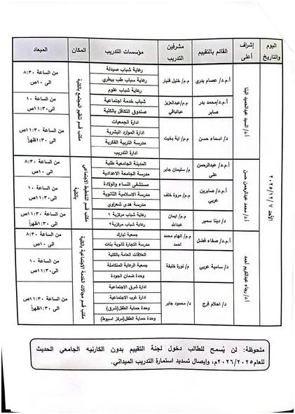 يُعلن عن عقد تقييم مجموعات التدريب الميداني للفرقة الرابعة للفصل الدراسي الأول للعام الجامعي ٢٠٢٦/٢٠٢٥، وذلك وفقًا لرقم المجموعة المدرج بالجدول، على مدار يومين: