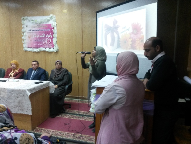 تعميقا لفكرة الارتباط فيم بيننا للوصول الى اعلى مستوى من كفاءة العمل للنهوض باسم كليتنا عاليا فى ظل ادارة السيد الاستاذ الدكتور /احمد محمد حسن البريرى –عميد الكلية اقامت ادارة العلاقت العامة" حفل عيد الام"وقد قدمت الادارة شهادات تقدير وهدايا للامهات المثاليات الذين يعطون من وقتهم وجهدهم لمصلحة العمل واقيم الحفل على شرف السيدة ا.د/بدرية شوقى عبد الوهاب - عميد الكلية سابقا واستاذ متفرغ بقسم التخطيط الاجتماعى وبحضورالسيدة /كريمة عبدالحميد سيد- امين عام الكلية