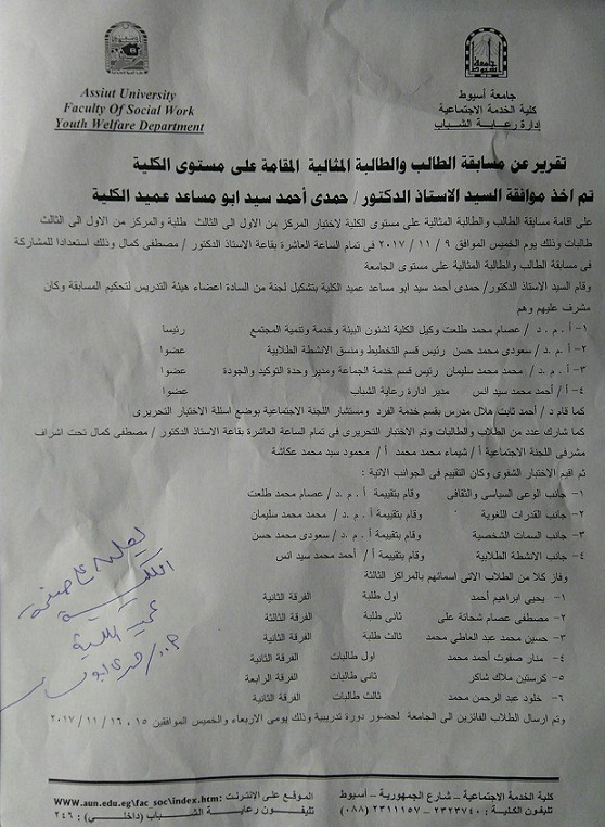 تقرير عن مسابقة الطالب والطالبة المثالية المقامة على مستوى الكلية 20 نوفمبر 2017 تقرير عن مسابقة الطالب والطالبة المثالية المقامة على مستوى الكلية