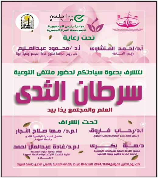 "Breast Cancer Awareness Forum... Science and Society; Hand in Hand" at Assiut University 3 November 2024 https://forms.gle/a1hnkbCxmc1c6RFu9 #إعلام_جامعة_أسيوط