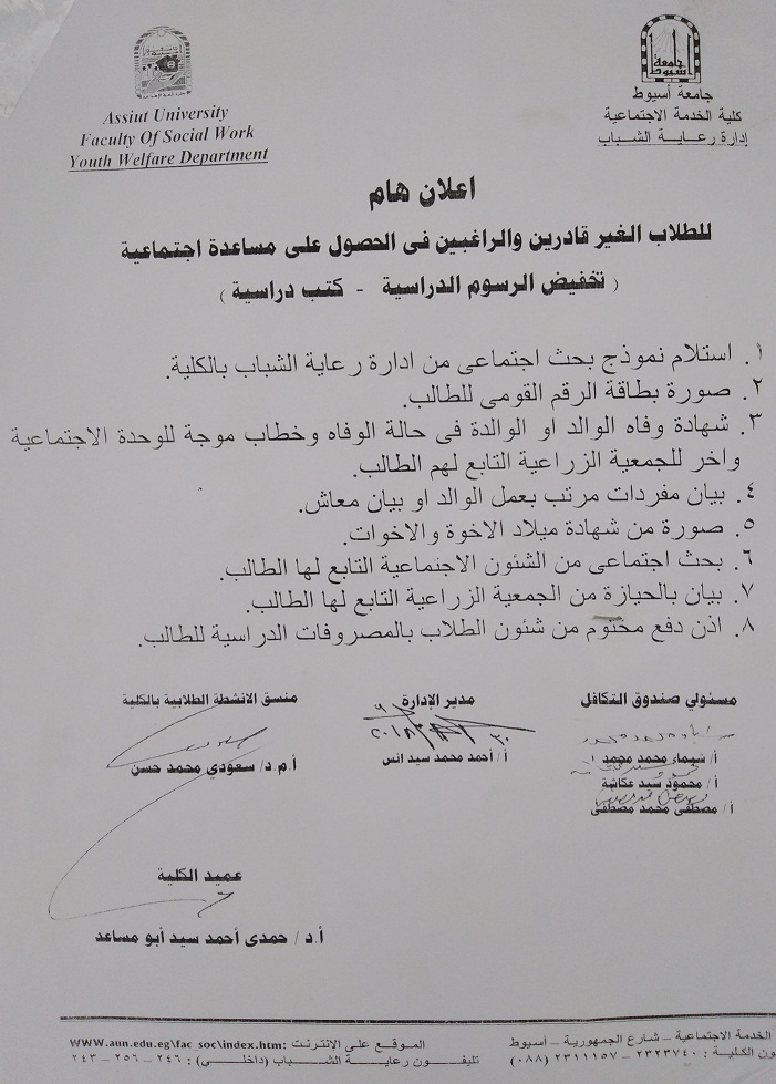 اعلان هام (للطلاب الغير قادرين والراغبين فى الحصول على مساعدة اجتماعية)