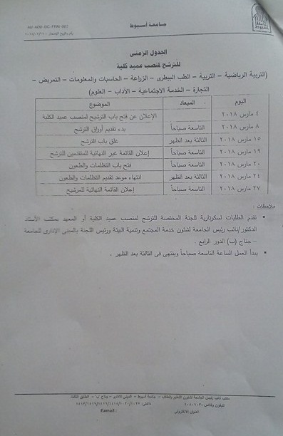 الجدول الزمنى الخاص بالتقدم لشغل وظيفة عميد الكلية مرفقا به شروط الترشح والأوراق المطلوبة 22 فبراير 2018 الجدول الزمنى الخاص بالتقدم لشغل وظيفة عميد الكلية مرفقا به شروط الترشح والأوراق المطلوبة