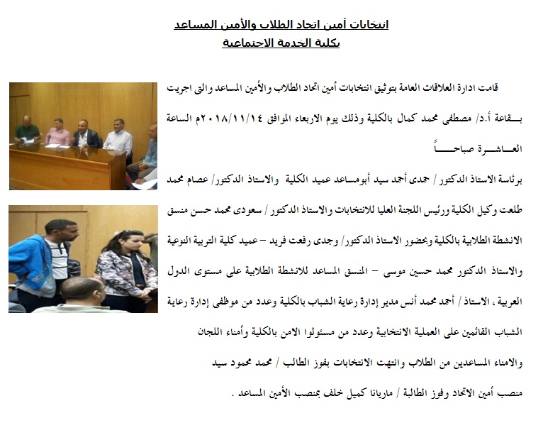 انتخابات أمين اتحاد الطلاب والأمين المساعد بكلية الخدمة الاجتماعية 15 نوفمبر 2018 انتخابات أمين اتحاد الطلاب والأمين المساعد بكلية الخدمة الاجتماعية