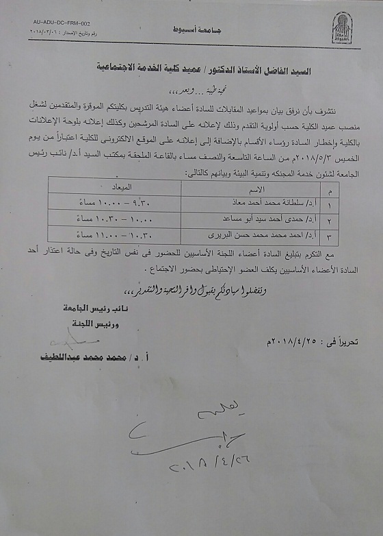 بيان بمواعيد المقابلات للسادة اعضاء هيئة التدريس والمتقدمين لشغل منصب عميد الكلية
