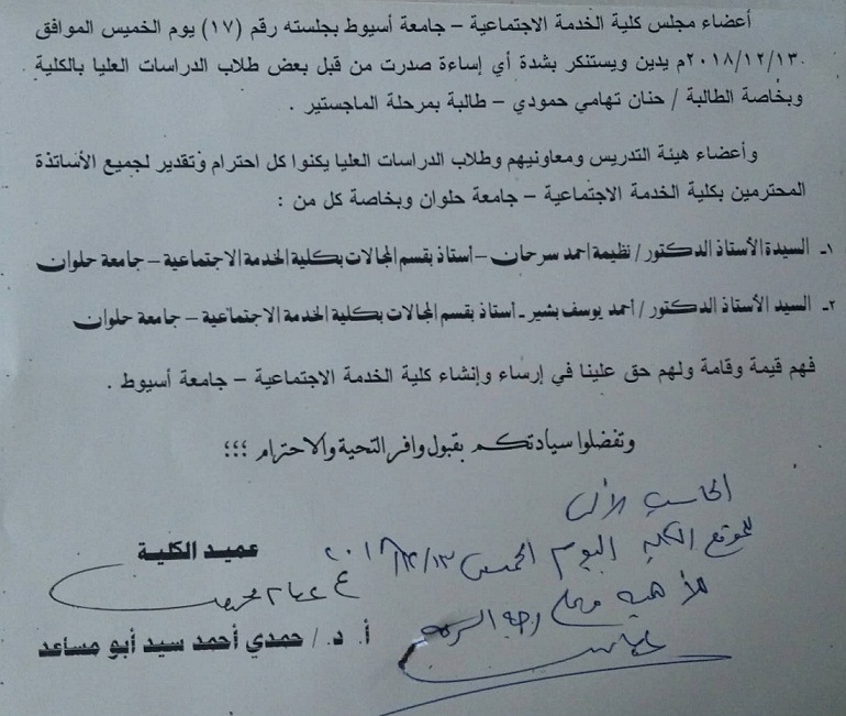 بيان من أعضاء مجلس كلية الخدمة الاجتماعية